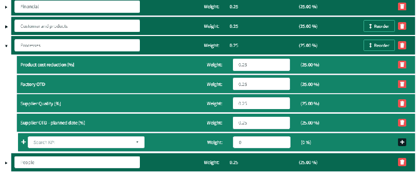 You can build a hierarchy of KPIs by pressing the arrow next to each level and repeat the process. Remember that the number of hierarchic levels in your scorecard is set during the creation process and can’t be changed afterward.